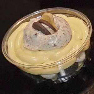 Ginger Snaps cookies, Smooth and creamy pudding mix, Milk, Fresh Bananas, Smooth and creamy whipped topping. This dessert contains dairy products.